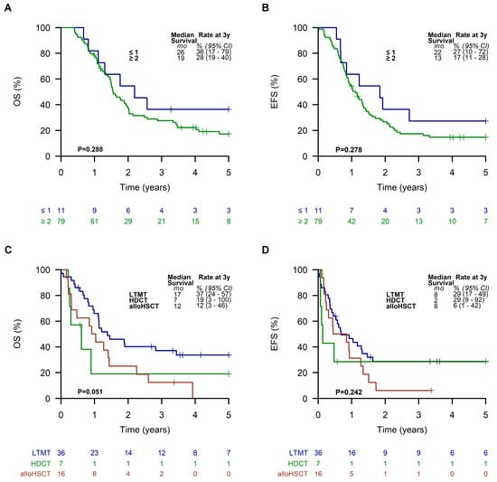 Descriptive statistics are presented as absolute value and percentages or median with range for categorized and quantitative variables. Patients’ characteristics variables were compared using Fisher’s exact test for categorical variables and Wilcoxon–Mann–Whitney tests for continuous variables. Median follow-up time of survival was obtained using the reverse Kaplan–Meier method. To estimate the probabilities of OS and EFS for all patients, the observation time was calculated from start of the initial chemotherapy to the respective event or last follow-up for censored patients. OS was defined as number of survivors minus the number of patients who died, independently of the cause of death. Events EFS were defined as disease progression or relapse, second malignancy, and non-relapse mortality, respectively. Non-relapse mortality was defined as death without prior relapse or progression. To estimate the probabilities of OS and EFS in patients receiving LTMT, HDCT, or alloHSCT, the observation time was calculated from the start of one of these three final treatment approaches. Probabilities of OS and EFS were estimated by the Kaplan–Meier product limit method. Univariate and multivariate comparisons of OS and EFS probabilities were performed using the Log-rank test. The association between patients’ characteristics and outcomes was analyzed using Cox proportional hazard models.