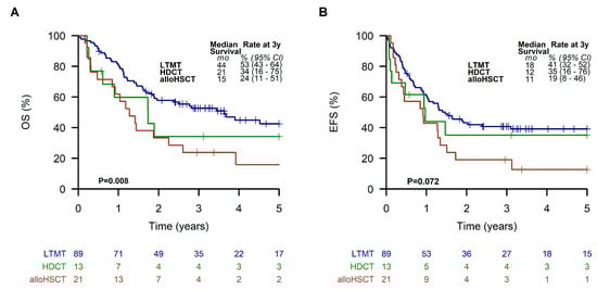 Patients receiving an LTMT had significantly (p = 0.02 and 0.002) better EFS and OS (41% (95% CI, 32 to 52%) and 53% (95% CI, 43 to 64%), respectively)) compared to patients finally treated with alloHSCT (EFS of 19%; 95% CI, 8 to 46%; OS of 24%; 95% CI, 11 to 51%). Results of patients receiving HDCT were similar to LTMT (EFS of 35%; 95% CI, 16 to 76%; OS of 34%; 95% CI, 16 to 75%) (Figure 7).