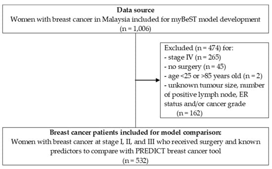 Thus, our current analysis aimed to compare the performance of locally adapted myBeST and western-centric PREDICT tools among women with breast cancer in Malaysia. The PREDICT model was chosen due to its superior performance compared to other tools (i.e., Adjuvant! Online and CancerMath) [16,17] and could predict five-year survival probability, which was the interest of this study.