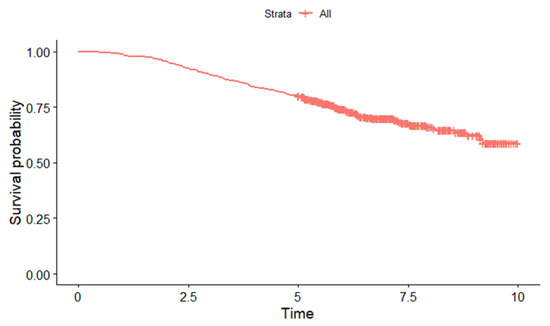 The five-year overall survival for all patients was 80.3% (95% CI: 77.0, 83.7). The Kaplan–Maier survival curve for the patients included for analysis is illustrated in Figure 2.