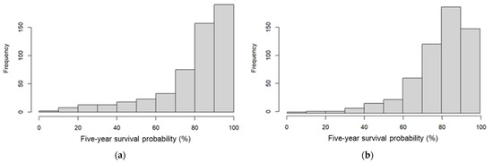 Distribution of predicted five-year survival probability by (a) PREDICT and (b) myBeST tool.