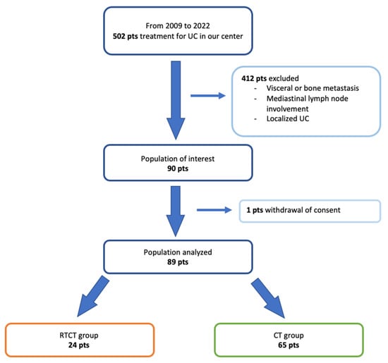 Flow chart. Pts: patients; UC/urothelial cancer; RTCT group: radiotherapy and chemotherapy group; CT group: chemotherapy group.