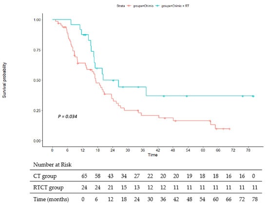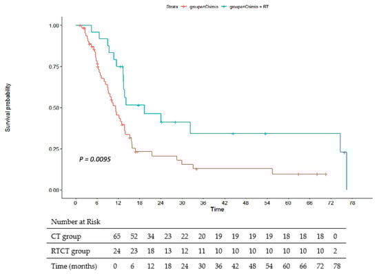 The median OS and PFS for all patients were 19.7 months (95% CI 16.5–22.9) and 13.4 months (95% CI 11.5–15.2), respectively. OS in the RTCT group was 26.3 months versus 17.2 months in the CT group with an HR at 0.52 (95% CI, 0.28–0.96) and p = 0.034. PFS in the RTCT group was 19.4 months versus 11.2 months in the CT group with a hazard ratio (HR) at 0.46 (95% CI, 0.25–0.84) and p = 0.009. Figure 2 and Figure 3 illustrate the OS and PFS, respectively.