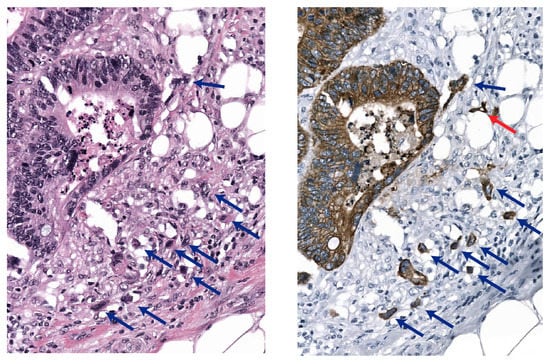 Under these circumstances, an immunohistochemical (IHC) pan-cytokeratin (CK) stain can be used to highlight the epithelium versus activated fibroblasts and immune cells (see Figure 1). Therefore, IHC is frequently used to help pathologists identify tumor buds (TBs) [2]. Several studies involving experienced gastrointestinal pathologists have reported the prognostic value of TB based on H&E staining, as well as on IHC [3,4,5]. At the same time, moderate-to-substantial inter-observer variability has been reported for TB scoring in both H&E and IHC, including our recent work [6]. This variability can potentially increase when non-subspecialist gastrointestinal pathologists are involved, especially when H&E slides are inspected.