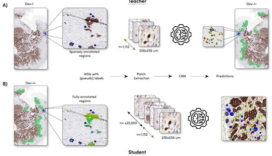 The best performing teacher network was applied to the WSIs of the dataset dev-l and dev-v, after which the candidates detected by the teacher model were added to the dataset dev-l and dev-v. Thereafter, two new deep learning networks, called student, will be trained on the combined dataset. A schematic overview of the method can be found in Figure 2.