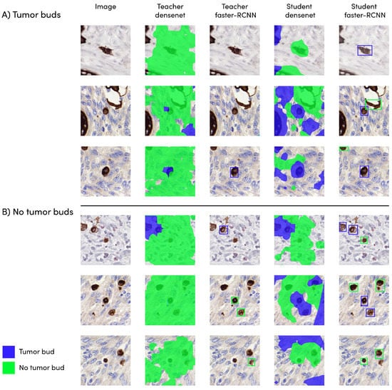 In line with the described semi-supervised method, two different networks (faster R-CNN and DenseNet) were trained as teacher models and subsequently the same types of networks were trained on the output of the best teacher. DenseNet was chosen as it is trained as a patch classifier that is unaffected by sparse annotations. Our results show that it indeed outperforms the faster R-CNN network as a teacher. The lower performance of DenseNet after training on the extended dataset may be related to its lower output resolution, an inherent limitation in this model that results in overlapping objects. Since we are using IHC-stained slides, this can be solved by multiplying the DenseNet output with the CK-positive channel of the image. However, this approach would move the problem to an accurate separation of signals (i.e., hematoxylin and DAB) in immunohistochemistry, potentially introducing additional noise (i.e., when the stain is weak) and is therefore suboptimal. As a detection network, we selected faster R-CNN because of the higher performance compared to other, faster popular detection networks, such as SSD [15]. However, for smaller objects, such as tumor buds, SSD performs significantly worse than faster R-CNN [21]. As speed was not our primary concern, we opted for faster R-CNN. This allows us to process the entire whole-slide image in approximately six minutes.