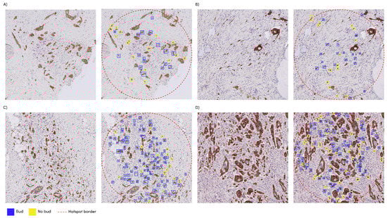 Based on the density map, we could extract the regions with the highest amount of tumor buds within the hotspot. We simply cannot select (center-)pixels with the highest TB density, as the related hotspot areas might overlap. To prevent this, we used the following steps within the whole slide image: (1) the location with the highest tumor bud number within the whole slide image was selected; and (2) we label any pixel within the selected hotspot area of a TB with a value of 0. By doing this, the next hotspot has a minimum distance of the radius of the hotspot, resulting in a maximum overlap of 50% between the hotspots; (3) repeat steps 1 and 2 until 10 locations are found.