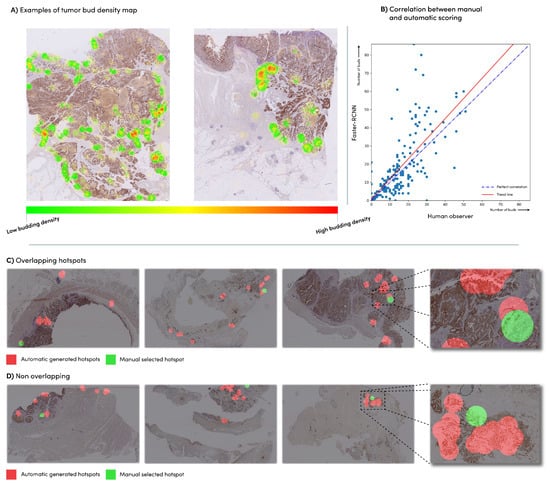 (A) Examples of a density heatmap generated based on the automatic tumor bud detections; (B) correlation between the manual tumor bud counts in the manual hotspot and the automatic count in the same hotspot; (C) Manually selected hotspots (green) vs. automatic hotspots (red). (A) cases with overlap; and (D) cases with no overlap.
