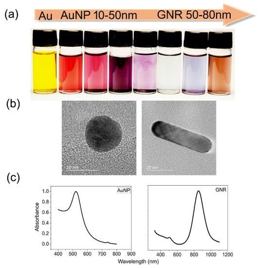 Among inorganic nanomaterials, AuNPs have been largely studied for those proposals. They can be synthesized from an Au donor, commonly chloroauric acid (HAuCl4), and engineered for different sizes and shapes according to the proposal. Moreover, each type of AuNP possesses characteristic spectra; for instance, spherical AuNPs have their absorption peak at 520 nm, while rod-like AuNPs, known as GNRs, have absorption peaks varying from 620 nm to 1000 nm, depending on their aspect ratio [15]. Low cytotoxicity, a huge volume/area ratio, which allows multiple surface coatings, and collective electron oscillations, recognized as localized surface plasmon resonance (LSPR), are the remarkable characteristics of these nanoparticles. AuNPs can absorb and scatter light within the visible light range, which is one of their most remarkable optical properties for biomedicine and enables them to interact with molecules in their vicinity. At the nanometer scale, their sensitivity is enhanced exponentially, and any minimal alteration can be detected and measured via dynamic light scattering, a property known as plasmonic shifts. Through a conventional plate spectrophotometry reader coupled with ultraviolet–visible light (UV-Vis), it is possible to perform diagnostics using AuNPs LSPR shifts [8,17], as well as via other spectroscopic techniques and tools; most of these spectrophotometers are already available for purchase. Another feature worth mentioning is the colorimetric changes, observable to the naked eye, that generate spectroscopic signatures that work as fingerprints, allowing their use for diagnosis and therapy. Additionally, AuNPs’ surface modifications are performed to enhance their bioavailability, as well as to protect the nanoparticle from the environment and efficiently target a specific tissue or cell type.