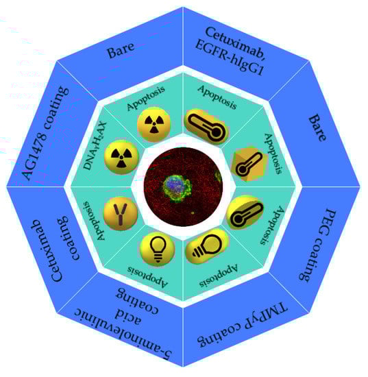 - Kashin, M.; Kakei, Y.; Teraoka, S.; Hasegawa, T.; Yamaguchi, A.; Fukuoka, T.; Sasaki, R.; Akashi, M. Gold Nanoparticles Enhance EGFR Inhibition and Irradiation Effects in Head and Neck Squamous Carcinoma Cells. Biomed Res. Int. 2020, 2020, 1281645. [Google Scholar] [CrossRef] [PubMed]