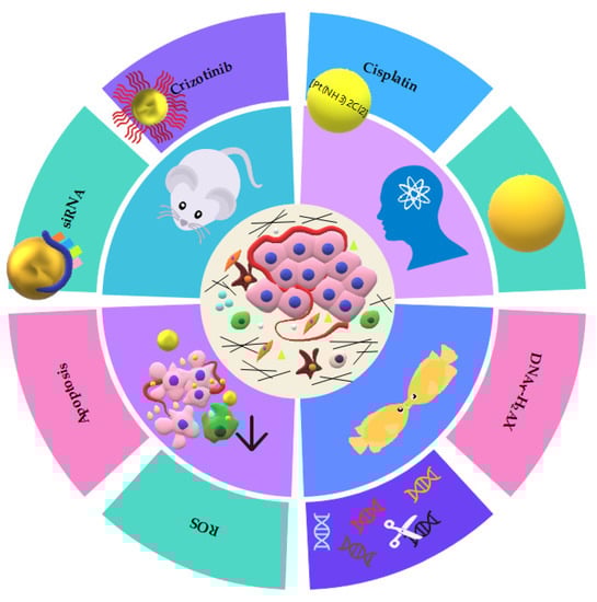 Interestingly, in a study, AuNPs were coated with Crizotinib, an anaplastic lymphoma kinase (ALK) inhibitor, for targeting and radiosensitization of adenoid cystic carcinomas (ACC). A sample from a patient with ACC of the parotid gland and its tumor molecular profiling identified an AKL mutation. Next, this sample was subcutaneously injected into nude mice and treated with AuNPs coated with Crizotinib, followed by irradiation. The data showed gold concentration in the tumor mass, a reduction in tumor volume, DNA damage, and apoptosis in the group treated with this nanocomplex [52].