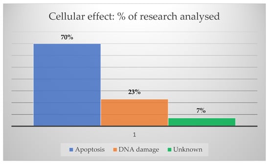 Considering the usual treatment modalities for HNC, RT seems to benefit from greater advantages in AuNP applications, considering the number of studies reported in the literature. On the other hand, new approaches such as immunotherapy have gained traction through several efforts to overcome immune-related toxicities and enhance therapeutic effects through their functionalization with AuNPs. The knowledge of the main mechanisms involved in cancer cell death when therapeutic candidates are evaluated is crucial. Therefore, using AuNPs, cellular death due to apoptosis appeared in 70% of the research papers analyzed, followed by 23% of DNA double-strand breaks, as shown in Figure 7.