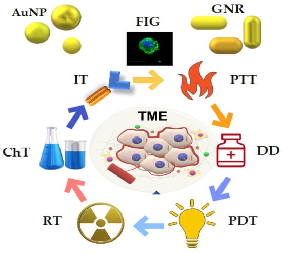 Theranostic applications of gold nanoparticles. AuNPs used for biomedical applications are sphere-shaped (AuNP) and rod-shaped (GNR). TME = tumor microenvironment; RT = radiotherapy; PTT = photothermal therapy; PDT = photodynamic therapy; IT = immunotherapy; ChT = chemotherapy; DD = drug delivery; FIG = fluorescence image-guided therapy.