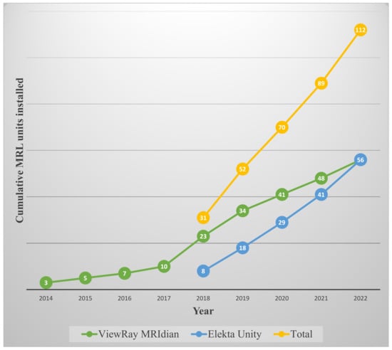 Cumulative installations of ViewRay MRIdian and Elekta Unity MRLs over time. ViewRay MRIdian was initially a tri-60Co system, with MRL installations beginning in 2017. All existing ViewRay MRIdian systems, except for one, have been upgraded to MRLs. Elekta Unity systems were initially pre-clinical until late 2019. All existing Elekta Unity systems have been upgraded to fully clinical systems. Data used for the creation of Figure 2 were directly provided by Elekta and ViewRay team members.