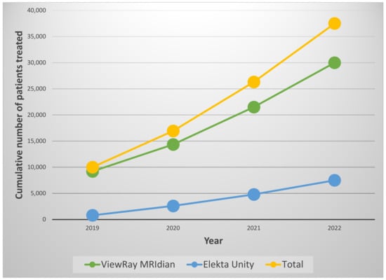Cumulative treatments of ViewRay MRIdian and Elekta Unity MRLs per year since 2019. Data used for the creation of Figure 3 were directly provided by ViewRay and from data presented at the 9th annual MR in RT symposium [25].