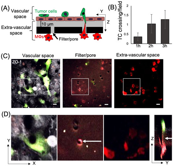 Macrophage TMCs connecting to tumor cells can be detected using an in vitro tumor cell extravasation transendothelial migration (eTEM) assay. (A) Schematic representation of the eTEM assay. The vascular space is contained in the upper part of the chamber and contains green labeled tumor cells on top of a confluent endothelial layer. The endothelial layer is supported by a matrigel (grey) coated filter with 8 µm pores with red labeled macrophages (MΦs) on the underside of the filter (the extra-vascular space). (B) The number of tumor cells (TC) crossing the endothelium over time was determined as the number per field in the extravascular space. (C) Representative images of the vascular space, the supportive filter, and the extravascular space. Tumor cells and macrophages are labeled using cell tracker green and cell tracker red, respectively, and endothelial cells are stained for the tight junction marker ZO-1 (white). Note, only tumor cells which cross an intact endothelium (determined by junctional ZO-1 staining in white) are quantified as crossing. If the endothelial monolayer is not intact (lacking junctional ZO-1 staining), tumor cells which may have crossed in this area are excluded from the quantification, shown in figure (B). Scale bar 15 μm (D) Magnified images of the boxed areas in (C) and an orthogonal (Y-Z) view of the Z-stack marked by boxed area in (C). White arrow indicates a TMC formed between a macrophage and tumor cell between the pore of the filter.