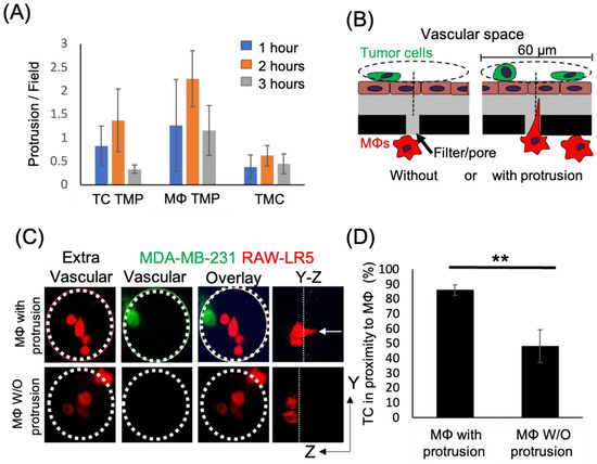 Macrophages play an important role in promoting metastatic seeding [18,19] and we previously detected stromal macrophages in contact with tumor cells arriving at the metastatic site [22]. However, it is unclear how macrophages in the lung parenchyma interact with CTCs in the vasculature. To specifically study the role of TMCs connecting macrophages to tumor cells through an endothelium, we employed an in vitro assay that mimics macrophage-assisted tumor cell extravasation, maintaining the physical characteristics, the physiology, and cellular orientation of macrophages and tumor cells in the lung vasculature (Figure 1A) [16]. We cultured a highly metastatic triple negative breast cancer cell line (MDA-MB-231) on a transwell membrane coated with an intact layer of endothelial cells. The endothelial layer separated the tumor cells from cells of a murine derived macrophage cell line (RAW 264.7/LR5) that were attached to the bottom of the filter. We could detect a small but insignificant amount of tumor cell crossing into the extravascular space (bottom of the chamber) starting an hour after the addition of tumor cells (Figure 1B). During this period, we observed macrophage membrane extensions spanning the endothelial layer and the filter’s pores connecting to tumor cells (TMCs). TMCs could be detected two hours post tumor cell seeding (Figure 1C,D). We then determined the frequency of tumor cells or macrophages to make thin membranous protrusions (TMPs) or connections (TMCs) into the layer between the two cell types over time. While not significant, macrophages seem to generate a greater number of protrusions compared to tumor cells (Figure 2A). We also investigated the conditions under which these macrophage protrusions occur in response to tumor cells. We determined whether there was an association between macrophages forming protrusions and the presence of tumor cells on the upper side of the endothelium in the vascular space. We measured the association of macrophages with or without protrusions through a pore towards the endothelial layer with the presence of tumor cells on the vascular side of endothelium within a diameter of 60 µm centered on the pore (Figure 2B). Our data shows that tumor cells are found more frequently associated to areas with macrophages containing protrusions (86%), while there was only a random association between macrophages without protrusions and tumor cells (48%) (Figure 2C,D). These data indicate that tumor cells are preferentially localized to areas above macrophages containing protrusions. However, it is unclear whether macrophage protrusions are being directed towards tumor cells, or whether tumor cells migrate towards sites above macrophages with protrusions.