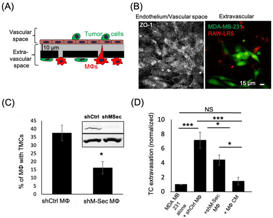 Macrophages defective in TMCs do not promote tumor cell extravasation. (A) Schematic representation of eTEM assay after overnight incubation to allow for maximal tumor cell crossing. The vascular space is contained in the upper part of the chamber and contains green labeled tumor cells on top of a confluent endothelial layer. The endothelial layer is supported by a matrigel (grey) coated filter with 8 µm pores with red labeled macrophages (MΦs) on the underside of the filter (the extravascular space). (B) Representative images of the intact endothelium stained for ZO-1 (left) in the vascular space and (right) the tumor cells (green) that have crossed into the extravascular space 24 h after tumor cell addition. (C) shRNA Control (shCtrl MΦ) or shRNA M-Sec (shM-Sec MΦ) macrophages were cultured overnight and the percentage of macrophages making TMCs between cells quantified. Inset-Western Blot showing M-Sec protein (upper) and actin (lower) level in macrophages expressing either shRNA control (shCtrl) or shRNA M-Sec (shM-Sec). Uncropped blot is shown in Figure S1. (D) The number of MDA-MB-231 tumor cells (TC) crossing the endothelial layer into the extravascular space after 24 h in absence (alone) or presence of RAW/LR5 macrophages that express shRNA Control (shCtrl MΦ) or shRNA M-Sec (shM-Sec MΦ), or in the presence of MΦ conditioned media (CM). The number of TCs present in the extravascular space, normalized to the number of TCs crossing alone. 25 fields per condition were analyzed for each of 3 independent experiments. * p < 0.05, *** p < 0.001, NS = non-significant.