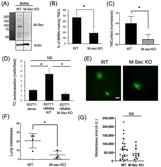 To verify the importance of macrophage TMCs in vivo we generated an M-Sec deficient mouse (M-Sec KO) using CRISPR. We verified the loss of M-Sec by Western blot analysis of isolated bone marrow-derived macrophages (BMMs) from both control and M-Sec KO mice (Figure 4A and Figure S1). We also quantified the ability of the BMMs to produce TMCs in vitro, which was reduced almost 60% in the M-Sec KO BMMs (Figure 4B). We also determined whether the reduction in TMC formation in M-Sec KO BMMs in culture was recapitulated in the eTEM assay. As expected, the number of connections between M-Sec KO macrophages and MDA-MB-231 cells was reduced by 70% (Figure 4C). The remaining TMCs in the M-Sec KO BMMs may be due to a residual level of M-Sec being present or because of alternative mechanisms of TMC formation (reviewed in [29,34]). We further investigated if the loss of M-Sec altered the ability of the macrophages to stimulate tumor cell extravasation in vitro. In this case, we used a murine metastatic breast tumor cell line expressing GFP (E0771-GFP). In accordance with our hypothesis that macrophage TMCs are critical for the promotion of tumor cell extravasation and our data using the shM-Sec cell line, loss of M-Sec in BMMs also significantly reduced tumor cell extravasation with no significant difference to baseline levels in vitro (Figure 4D). This data confirmed that M-Sec KO BMMs recapitulated the data using the shM-Sec cell line (Figure 3D) and suggested that the M-Sec KO mouse model can provide valuable in vivo data.