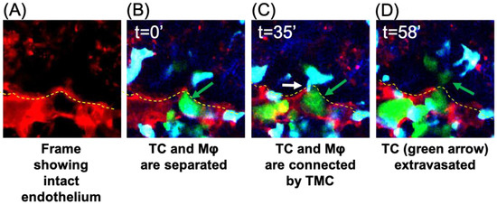 Our initial intravital imaging of macrophages interacting with tumor cells during extravasation in vivo suggests that macrophages contact tumor cells through TMCs, which may initiate or enhance trans-endothelial migration of tumor cells. Additional studies are needed in order to determine the frequency and kinetics of macrophage TMC contact with tumor cells in vivo before, during, and after extravasation.