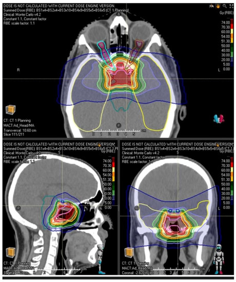 In approximately 5% of cases, distant metastases to lung, brain or bone may occur even years after the initial disease presentation [10,11]. Surgery represents the mainstay treatment for skull base chordomas. However, complete tumor resection resulting in negative surgical margins frequently cannot be accomplished due to the anatomical complexity of the skull base region and the highly infiltrative nature of this disease, with frequent involvement of the surrounding vascular and neurological critical structures [12,13]. Surgical resection with maximal tumor excision followed by high-dose postoperative radiotherapy represents the standard of care. According to the available literature data, the reported 5-year overall survival and local control rates following surgery and adjuvant radiotherapy range from 60% to 80% [14,15,16,17], and 69.6% to 75.8% [18,19,20,21,22], respectively. Since chordomas are radio-resistant tumors, eradication requires high-dose radiation ranging from at least 74 Gy up to 78 Gy (1.8–2 Gy per fraction). Since this radiation dose largely exceeds the tolerance of the nearby critical organs, it is frequently delivered by protons or carbon ions because of their physical characteristics, which provide a steeper dose gradient when compared with photon radiotherapy.