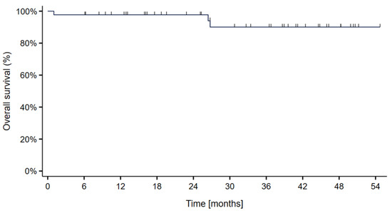 Figure 3. Kaplan–Meier curve showing the overall survival probability in 44 skull-base chordoma patients treated with particle therapy at MedAustron.