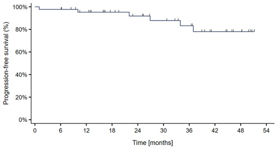 Figure 4. Kaplan–Meier curve showing the progression-free survival probability in 44 skull-base chordoma patients treated with particle therapy at MedAustron.