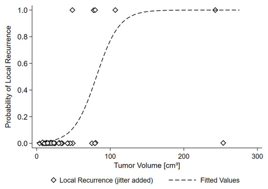 The possible influence of tumor volume on tumor recurrence was tested by logistic regression with progression as the dependent, and tumor volume as the independent variable. Furthermore, a non-linear model was fitted (Formula (1)). The inflection point of the sigmoid curve was interpreted as the threshold for an increased risk of recurrence. A p-value less than 0.05 was regarded as significant in all tests.