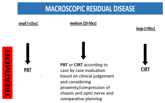 For large (>50 cc) residual disease, we initially discuss the feasibility of further surgical debulking with the referring neurosurgeon. However, in clinical practice there are various factors—including clinical or logistical considerations or patient’s refusal—may preclude maximal debulking. In such cases, we select carbon ion radiotherapy.