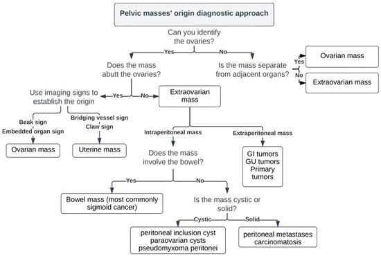 To establish an ovarian origin of a pelvic mass, the following stepwise approach may be used: