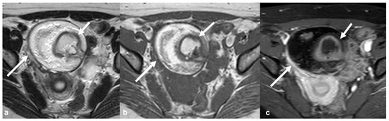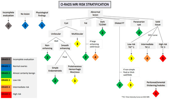 MRI is a problem-solving tool for preoperative characterization and subsequent risk stratification of indeterminate adnexal masses [12,13,14,15]. MRI provides better contrast resolution between different soft-tissue components (e.g., fat, hemorrhage, fibrous tissue) without the use of ionizing radiation [16]. The Ovarian-Adnexal Reporting and Data System (O-RADS) MRI is a recently developed and validated scoring system which is now proposed for risk assignment of sonographically indeterminate adnexal masses. This MRI scoring system includes six categories with different risks of malignancy and it is based on MRI features with high positive and high negative predictive values in distinguishing benign from malignant masses [17] (Figure 2).