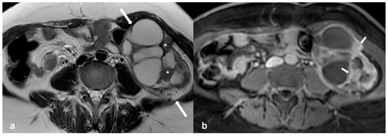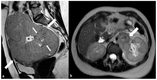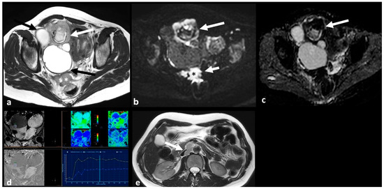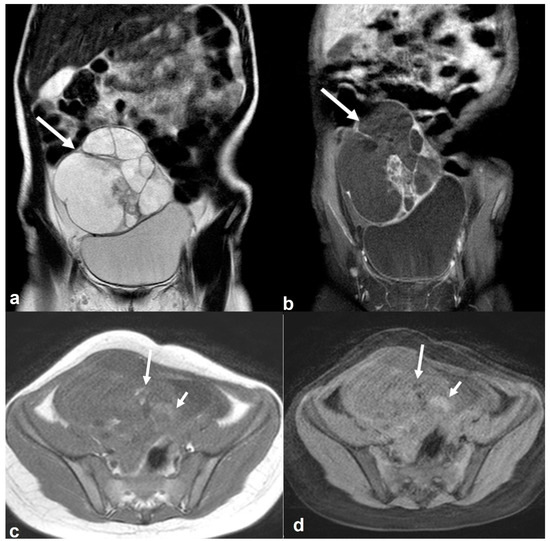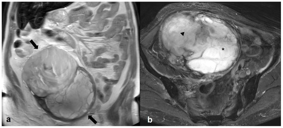 At imaging, their size varies from microscopic to huge; in a series by Moon et al. including eight tumors, the mean size was reported to be 11 cm [75]. In addition, about half of the cases demonstrated extensive amorphous punctuate calcifications [75]. Characteristically, the solid component exhibits markedly low T2 signal intensity on MRI because of dense fibrous stroma [37,75]. Brenner tumors can coexist with mucinous tumors in the same ovary. Findings suggestive of malignancy in a Brenner tumor, include large cystic parts and an inhomogeneous solid component (i.e., with mild enhancement, due to coexistence of fibrous and malignant components [74,75] (Figure 13).