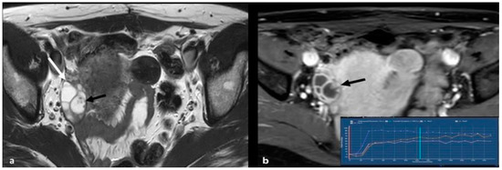 Serous epithelial borderline ovarian tumor. Axial T2 weighted image (a) shows a multiloculated cystic lesion at the right ovary (white arrow). A small, papillary projection (black arrow) is present, with avid enhancement on the T1 weighted FS CE image ((b), black arrow). An intermediate-risk time intensity curve (TIC type 2) was detected on DCE image analysis (inset in b, blue line: myometrium, orange/pink lines: papillary projection).