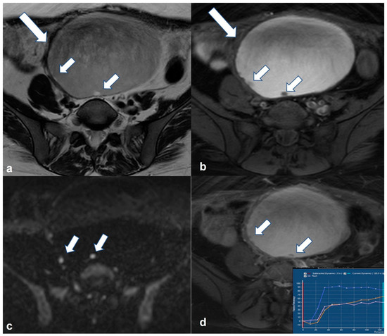 Endometrioid borderline ovarian tumor Axial T2 weighted image (a) shows a cystic mass (large arrow) originating from the right ovary with hemorrhagic content on corresponding axial T1 weighted FS image (b). There are small mural nodules in the right posterolateral aspect of the lesion (small arrows in a and (b)) with restricted diffusivity on corresponding axial high b value DWI image (small arrows in (c)). Note the enhancement of the nodules on the corresponding axial T1 weighted FS CE image (small arrows in (d)). DCE analysis showed a type 2 time–intensity curve (inset in (d), blue line: uterus; yellow/pink line: nodules).