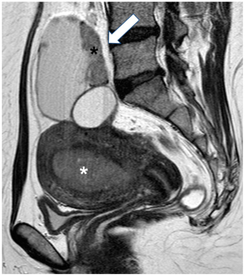 Synchronous ovarian and endometrial endometrioid adenocarcinoma. Sagittal T2 weighted image shows a soft-tissue mass occupying the endometrial cavity (white asterisk). Note a solid and cystic mass of the right ovary (arrow) with the solid component (black asterisk) exhibiting similar signal intensity to that of the endometrial mass.