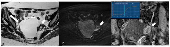 Typically, on MRI, they present as solid ovarian masses with low T2 signal intensity relative to muscle. However, T2 signal intensity may be higher when oedema or cystic degeneration co-exist (most often in thecomas) [64]. In most cases, they demonstrate low signal intensity both on DWI and ADC maps (known as the T2 blackout effect) due to the presence of fibrous tissue [65,66]. On DCE, they demonstrate minimal enhancement initially, which increases on delayed images; this perfusion pattern corresponds to TIC type 1 (i.e., mild and gradual increase in signal over time with no well-defined shoulder and no plateau) [66] (Figure 10).