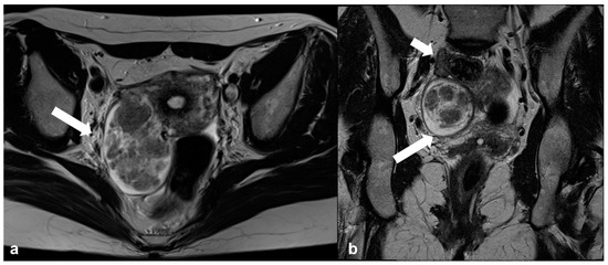 - Nougaret, S.; Nikolovski, I.; Paroder, V.; Vargas, H.A.; Sala, E.; Carrere, S.; Tetreau, R.; Hoeffel, C.; Forstner, R.; Lakhman, Y. MRI of Tumors and Tumor Mimics in the Female Pelvis: Anatomic Pelvic Space–Based Approach. RadioGraphics 2019, 39, 1205–1229. [Google Scholar] [CrossRef]