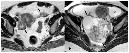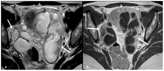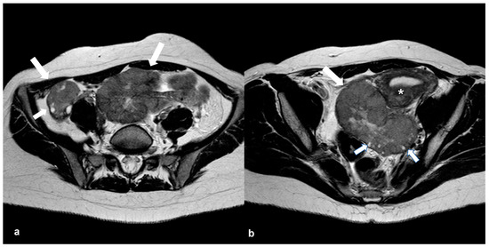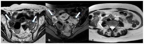 - Bourgioti, C.; Preza, O.; Panourgias, E.; Chatoupis, K.; Antoniou, A.; Nikolaidou, M.E.; Moulopoulos, L.A. MR Imaging of Endometriosis: Spectrum of Disease. Diagn. Interv. Imaging 2017, 98, 751–767. [Google Scholar] [CrossRef]