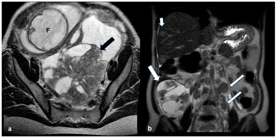 Ovarian tumors in children and adolescents differ from those in adults, regarding incidence, histology, and presentation. In general, ovarian neoplasms in childhood are uncommon and usually benign, with germ cell tumors (GCTs) being the most common type, followed by epithelial and stromal cell tumors [28]. In many cases, they present with abnormal hormonal secretion, unusual sexual development, and increased serum tumor markers (i.e., AFP in immature teratoma and yolk sac tumor, β-hCG in dysgerminoma, CA-125 in epithelial neoplasms). Imaging can help discriminate between benign and malignant ovarian neoplasms since malignant masses usually appear predominantly solid, more heterogeneous, and larger than benign tumors. In a recent study MRI showed 100% specificity and sensitivity in differentiating benign and malignant pediatric ovarian tumors [29].