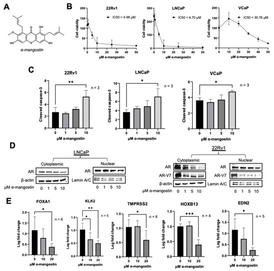 Figure 1. α-Mangostin promotes apoptosis and inhibits nuclear translocation. (A) Structure of α-mangostin. (B) Cells were treated with α-mangostin and cell viability was determined by MTT assays. (C) Cells were treated with 0–20 μM α-mangostin for 24 h and cleaved caspase-3 levels were analyzed by ELISA. 30 µg of protein from cell lysates were used. (D) Nuclear and cytoplasmic fractions from cells treated with α-mangostin for 24 h were analyzed for androgen receptor expression by Western blot. (E) AR- and AR-V7-regulated genes were analyzed by qPCR in 22Rν1 cells treated with α-mangostin for 24 h. * p ≤ 0.05, ** p ≤ 0.01, and *** p ≤ 0.001. The uncropped blots are shown in File S1.