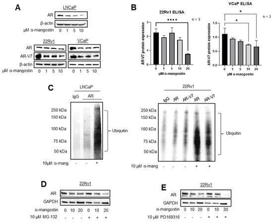 Figure 2. α-Mangostin promotes the ubiquitination and degradation of AR and AR-V7 via the proteasome. (A) AR and AR-V7 expression was evaluated in α-mangostin-treated PCa cells, including LNCaP, 22Rν1, and VCaP cells. (B) 22Rν1 and VCaP cells were treated with α-mangostin for 24 h and then whole cell lysates were evaluated for their expression of total AR-V7 through ELISA assays. (C) AR proteins from LNCaP and AR and AR-V7 proteins from 22Rν1 were immunoprecipitated with either anti-AR or anti-AR-V7 antibodies. Ubiquitinated AR and AR-V7 were analyzed by Western blot. (D) AR expression was analyzed after either individual or co-treatments of α-mangostin and/or MG-132. (E) AR expression was analyzed after either individual or co-treatments of α-mangostin and/or PD169316. * p ≤ 0.05 and **** p ≤ 0.0001. The uncropped blots are shown in File S1.