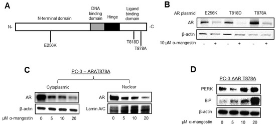 Figure 3. α-Mangostin decreases mutant AR expression and promotes the expression of BiP. (A) Structure of AR with single amino acid point mutations. (B) AR expression was evaluated in α-mangostin-treated PC-3 cells that had been transfected with 0.5–1 µg of ΔAR E256K, T818D, or T878A plasmid. (C) AR expression was evaluated in PC-3 cells treated with varying concentrations of α-mangostin that had been transfected with 0.5 µg of ΔAR T878A plasmid. (C) AR expression was evaluated in the nuclear and cytoplasmic fractions of cell lysates from α-mangostin-treated PC-3 cells transfected with 0.5 µg of ΔAR T878A plasmid. (D) Westerns of PERK and BiP expression in PC-3 cells transfected with ΔAR T878A cDNA after 24-h treatments. The uncropped blots are shown in File S1.