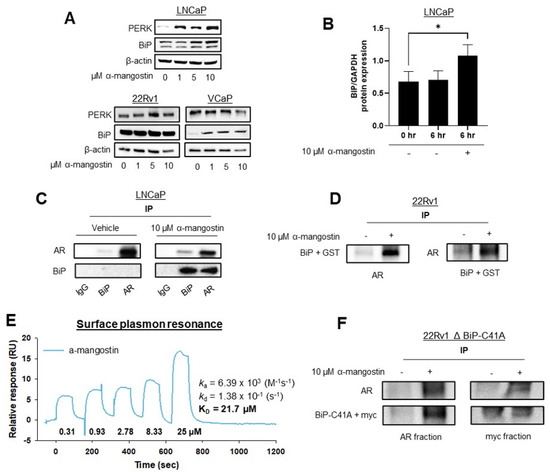 Figure 4. α-Mangostin increased BiP expression, promoted a protein-protein interaction between AR and BiP, and binds to BiP. (A) Westerns of PERK and BiP expression after 24-h treatments. (B) Quantification of Western blots evaluating BiP expression after 6-h treatments with α-mangostin in LNCaP cells. (C) Immunoprecipitation performed in LNCaP cells after 24-h treatments of 10 µM α-mangostin. The AR-protein and BiP-protein that were pulled down were both analyzed for the presence of AR and BiP. (D) 22Rν1 cells were transfected with 15 μg of BiP + GST cDNA. After 24 h, cells were treated with 10 μM α-mangostin and both AR-protein and BiP + GST protein were immunoprecipitated and analyzed for the presence of AR or GST. (E) SPR analysis of the His-GST-BiP protein revealed that α-mangostin bound to BiP. (F) BiP plasmid containing a C41A mutation (15 μg) was transfected into 22Rν1 cells. Immunoprecipitation analyses were repeated, and lysates were analyzed for the presence of AR or myc. * p ≤ 0.05. The uncropped blots are shown in File S1.