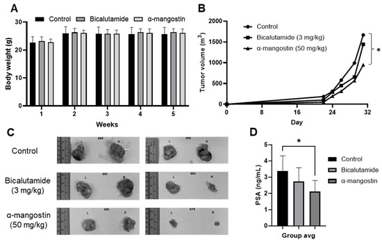 Figure 5. α-Mangostin is more effective Than bicalutamide at reducing tumor size and slowing cancer growth in a 22Rν1 xenograft study. (A) The body weights of three cohorts (control, bicalutamide, or α-mangostin) were measured weekly for the duration of the study. (B) Tumor volume measurements were taken five times during the study using a digital caliper. (C) After the animal sacrifice, mouse tumors were photographed. (D) Mouse plasma was collected 1 h after dosing on the day of sacrifice. 50 μL of either the PSA standard or plasma sample was added to a pre-treated ELISA plate, and absorbance readings were taken. * p ≤ 0.05.