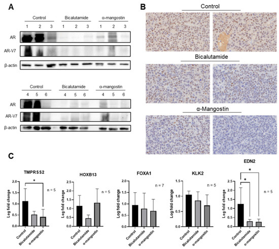 Extracted protein from tumor tissues was analyzed for AR and AR-V7 expression via Western blots. This revealed that there was considerable overexpression of both AR and AR-V7 in the control group, while there were decreases of AR and AR-V7 in the bicalutamide and α-mangostin groups, and in some cases even total depletion (Figure 6A). Routine immunohistochemistry was also performed on tumor tissues and was stained with an AR antibody, showing that there were decreases in the expression of AR in the bicalutamide and α-mangostin groups (Figure 6B). RNA was extracted from tumor tissues, and qPCR analyses of AR and AR-V7 regulated genes revealed that there were significant decreases in TMPRSS2 and EDN2 expressions in the bicalutamide and α-mangostin groups (Figure 6C).