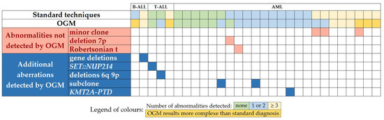 In conclusion, all of the 27 abnormalities that had a diagnostic relevance and/or prognostic impact were correctly detected by OGM, and additional abnormalities reported by OGM did not modify the risk group the patients were assigned to. Thus, OGM had 100% concordance with standard techniques for the classification of AML and ALL according to the WHO and the International Consensus Classification [25] and for AML stratification according to the ELN classification.