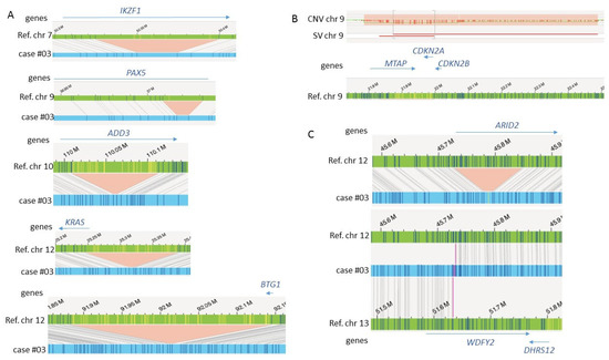 OGM detected additional abnormalities not described by standard techniques including aberrations cryptic at the karyotype level in several patients. First, in B-ALL case #03 with complex karyotype and BCR::ABL1 fusion, OGM detected infrachromosomal deletions characteristic of B-ALL, namely recurrent deletions in IKZF1, PAX5, BTG1, ADD3 genes, and CDKN2A biallelic deletion (Figure 4) [21]. OGM also showed a 135 kb-deletion encompassing the 5′-part of KRAS and a translocation t(12;13) inducing a putative novel fusion of the WDFY2 gene with the ARID2 gene, a component of the SWI/SNF complex with tumor suppressive properties that play a role in the differentiation of hematopoietic stem cells [22,23]. Interestingly this translocation is associated with an intragenic deletion of ARID2, which could result in haploinsufficiency.