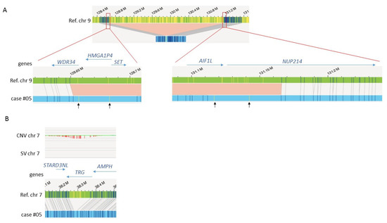 OGM results on case #05. (A) OGM detected a 2.46 Mb deletion at 9q34.11-q34.13 ((upper) figure) but did not identify the SET::NUP214 fusion. Detailed views at the breakpoints ((lower) figures) depict two labels not aligned to the reference genome (indicated by black arrows) at any of the breakpoints so that the breakpoint at 9q34.11 is incorrectly located in the WDR34 gene. If the two non-aligned labels are considered to align with the reference genome at 9q34.11, the breakpoint should be localized in the SET gene. (B) Deletion at the TCR gamma (TRG) locus that is not called by the SV or CNV pipelines, although the CNV track shows an inflection corresponding to the loss.
