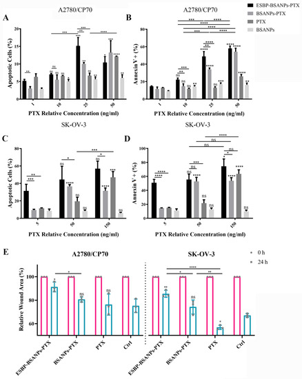 3.3. ESBP-BSANPs-PTX Induced Apoptosis and Inhibited Cell Migration in Ovarian Cancer Cells