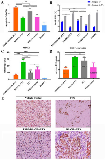 3.5. ESBP-BSANPs-PTX Induced Apoptosis in Ascites and Reduced MDSCs
